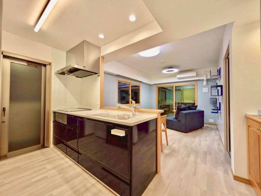 ★木製ドア、ブルーのキッチン、アクセントクロス・・・